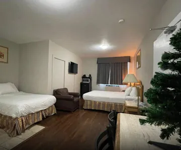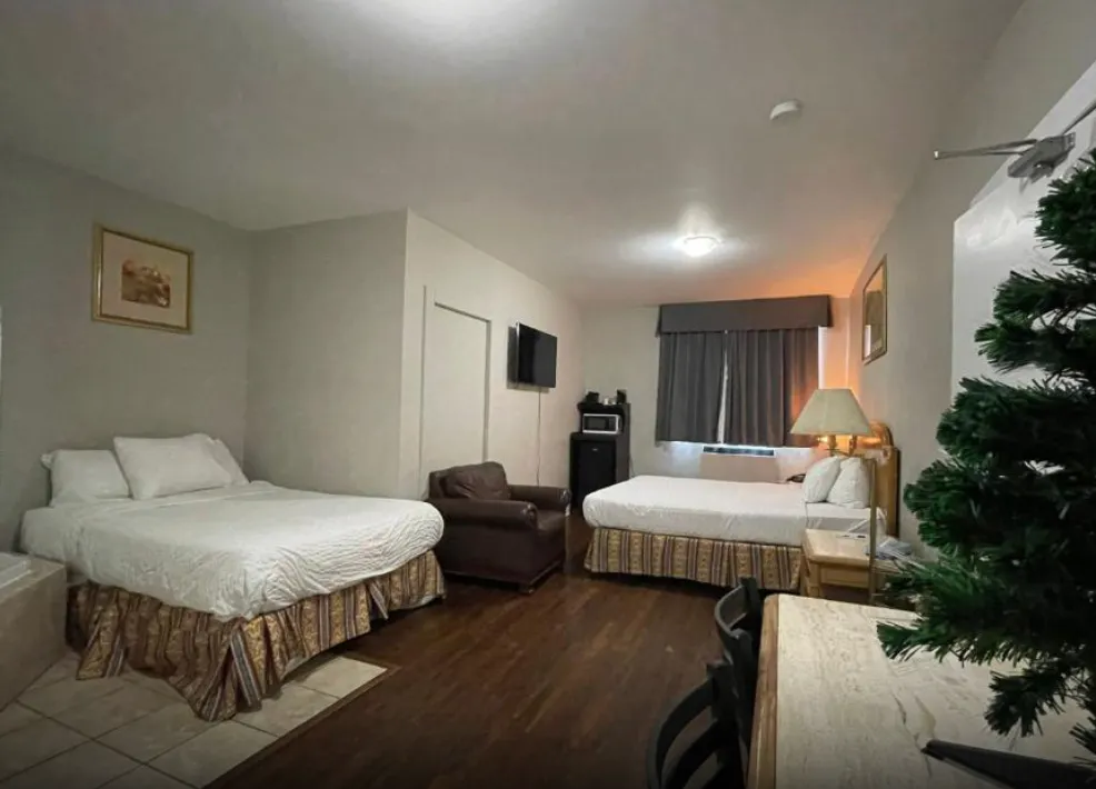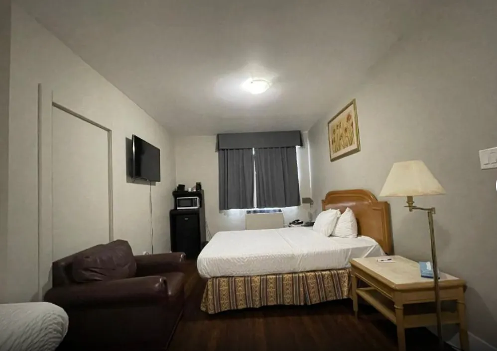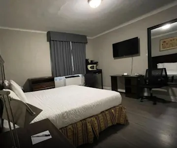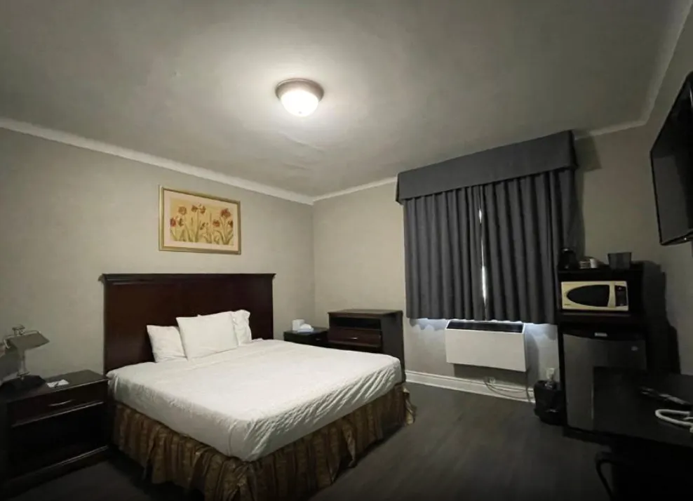 This spacious room includes a King-sized bed, a private bathroom with a shower tub and some essential toiletries . The room also provides air conditioning and heating, blackout curtains for added privacy, a private entrance, coffee maker, wardrobe space and a flat-screen SMART TV with streaming services, a mini-fridge and a micro-oven. Live like the King you are.